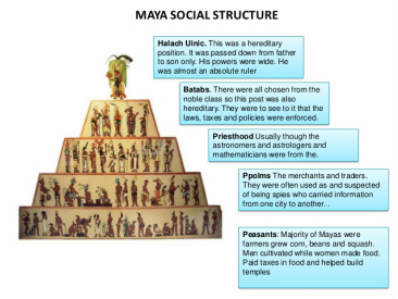 The Maya had a class society. As in other Mesoamerican cultures, an individual’s daily life depended on his or her social class. There were slaves, farmers, artisans and merchants, nobility, priests and leaders. There were also warriors. The highest class was made up of the nobility. In addition to the king, nobles included priests, scribes, government officials, and elite warriors. The middle class consisted of artisans, traders, weavers, potters and other warriors. At the basis of the social order were farmers, other workers and slaves. The Mayan social structure was quite rigid without much room for mobility, even from one generation to the next. From the king down, for example, a Mayan man’s work was inherited from his father. If your father was a farmer, you were a farmer. There were some exceptions, but they were rare. There was a little more flexibility for women. Some women were involved in government, economics and religion. At the same time, however, they were still responsible for caring for the children and running the household, just like their mothers.